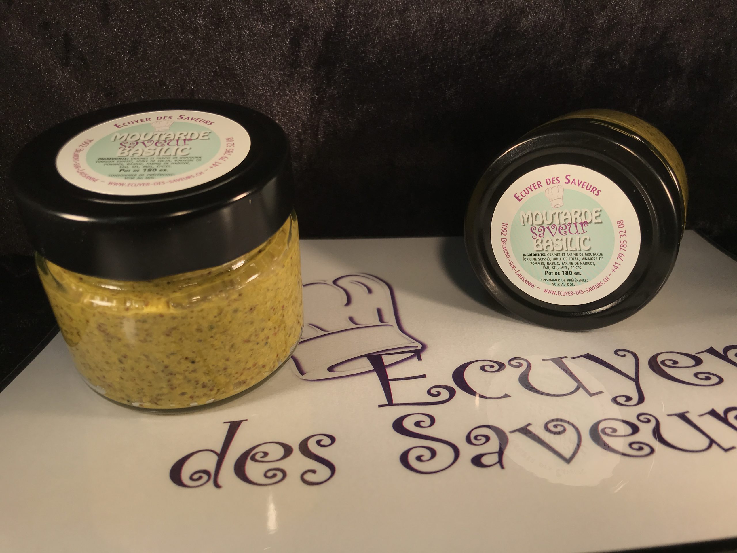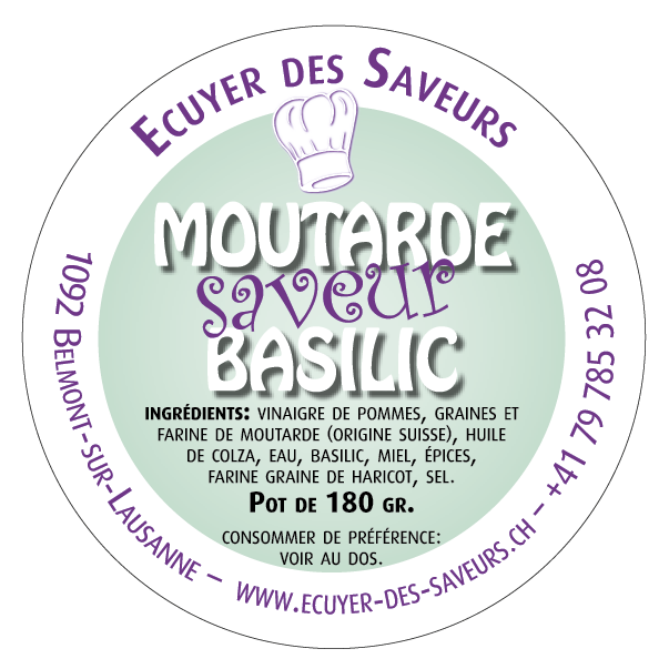 Moutarde au basilic élaborée par nos soins avec graines Vaudoise.